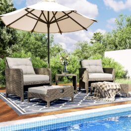 Pamapic Outdoor Furniture 5 Piece Patio Conversation Set, Wicker Rattan Patio Set with Soft Cushions & Coffee Table, Balcony Furniturefor with 2 Ottoman for Porch, Garden, Lawn (Grey)