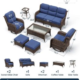 HILLGA 7-Piece Luxury Patio Furniture Set with 6″ Thick Cushions, Weather-Resistant Wicker High Back Swivel Rocker Chairs, Senior-Friendly Outdoor Sofa Set for Large Deck, Yard and Poolside, Blue(V2)
