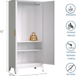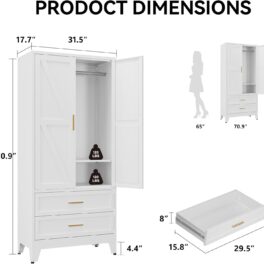 COFaR 71″ Metal Wardrobe Closet with 2 Drawers & Hanging Rod, Freestanding Armoire Storage Cabinet with Adjustable Shelf and 2 Doors, White Steel Closet Organizer for Bedroom