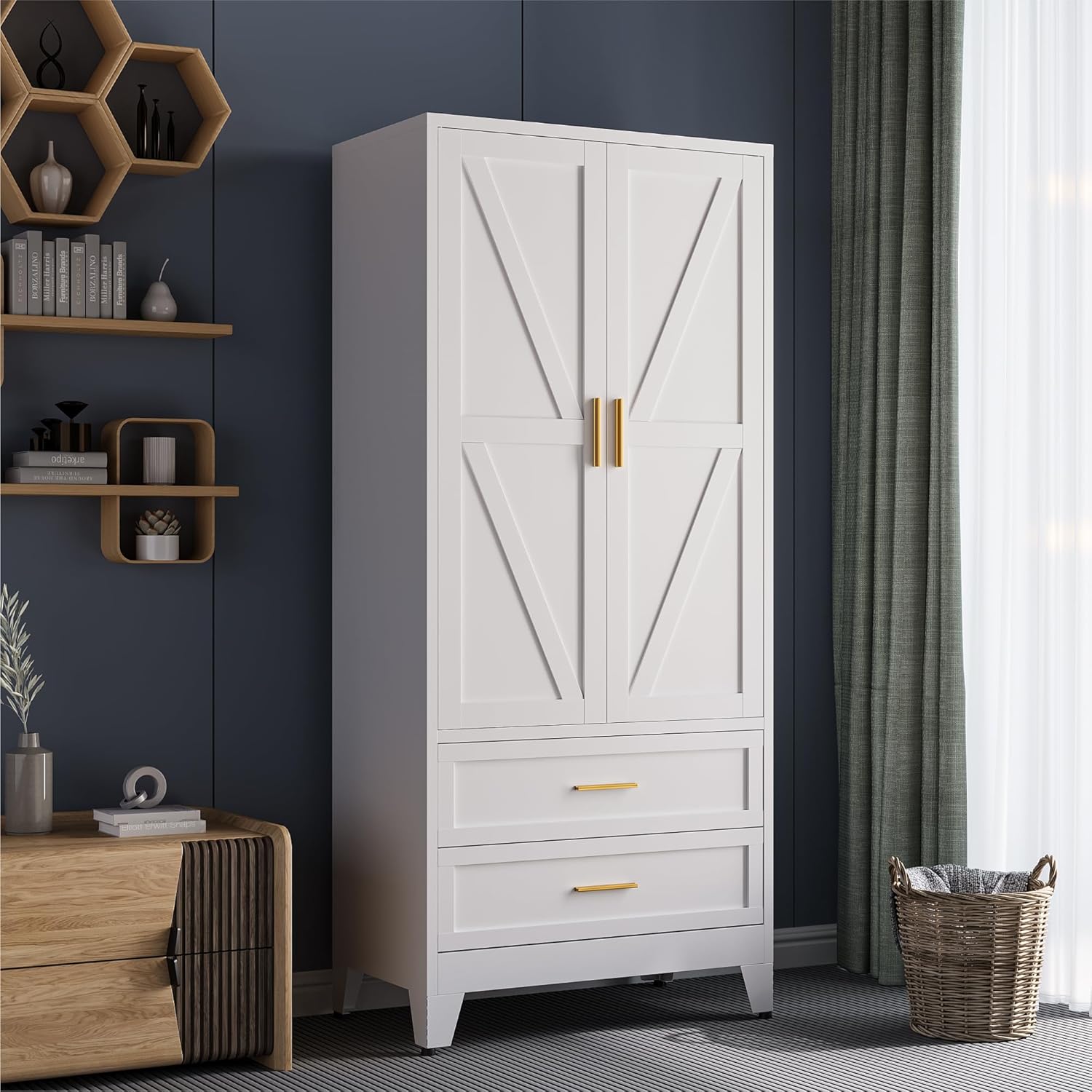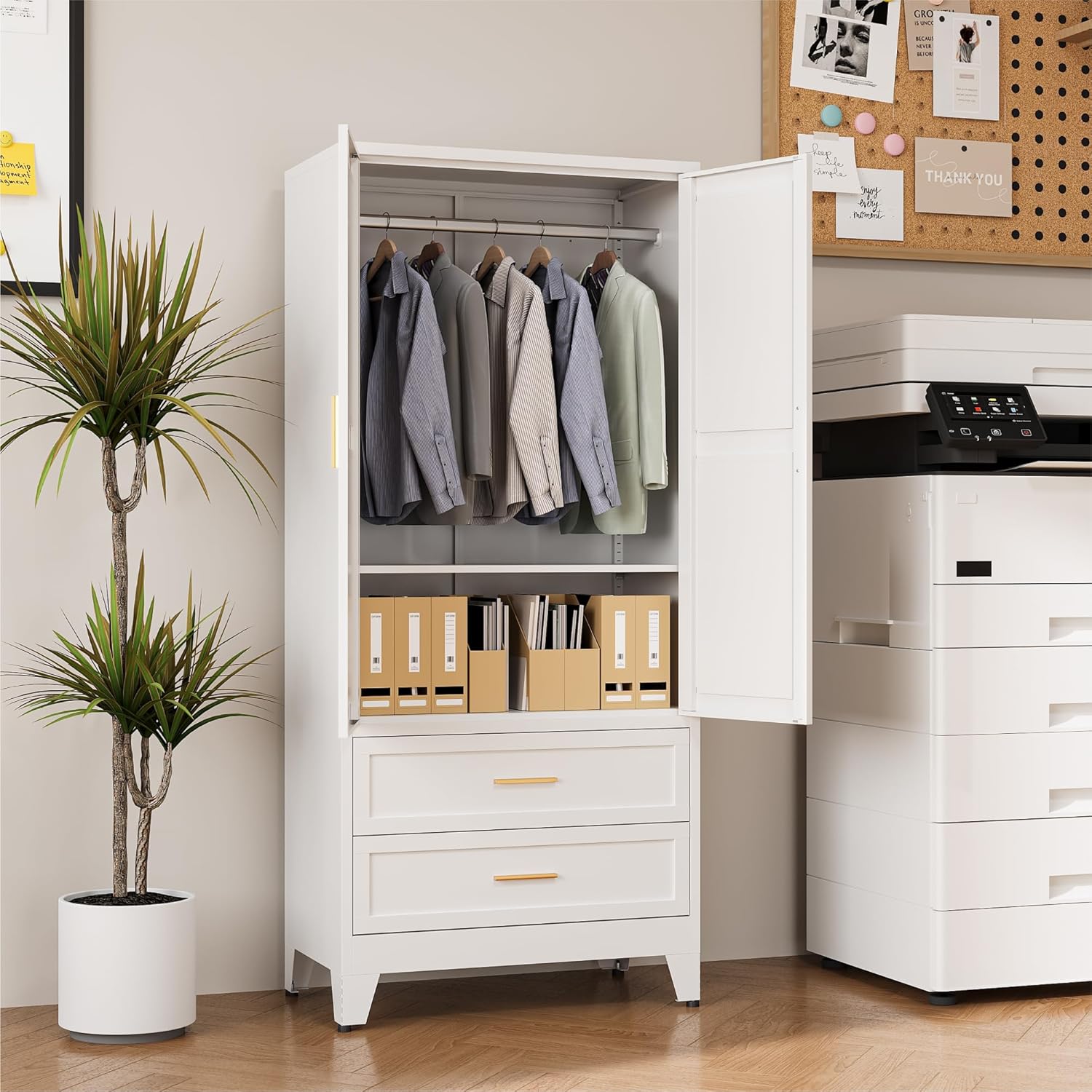 COFaR 71″ Metal Wardrobe Closet with 2 Drawers & Hanging Rod, Freestanding Armoire Storage Cabinet with Adjustable Shelf and 2 Doors, White Steel Closet Organizer for Bedroom