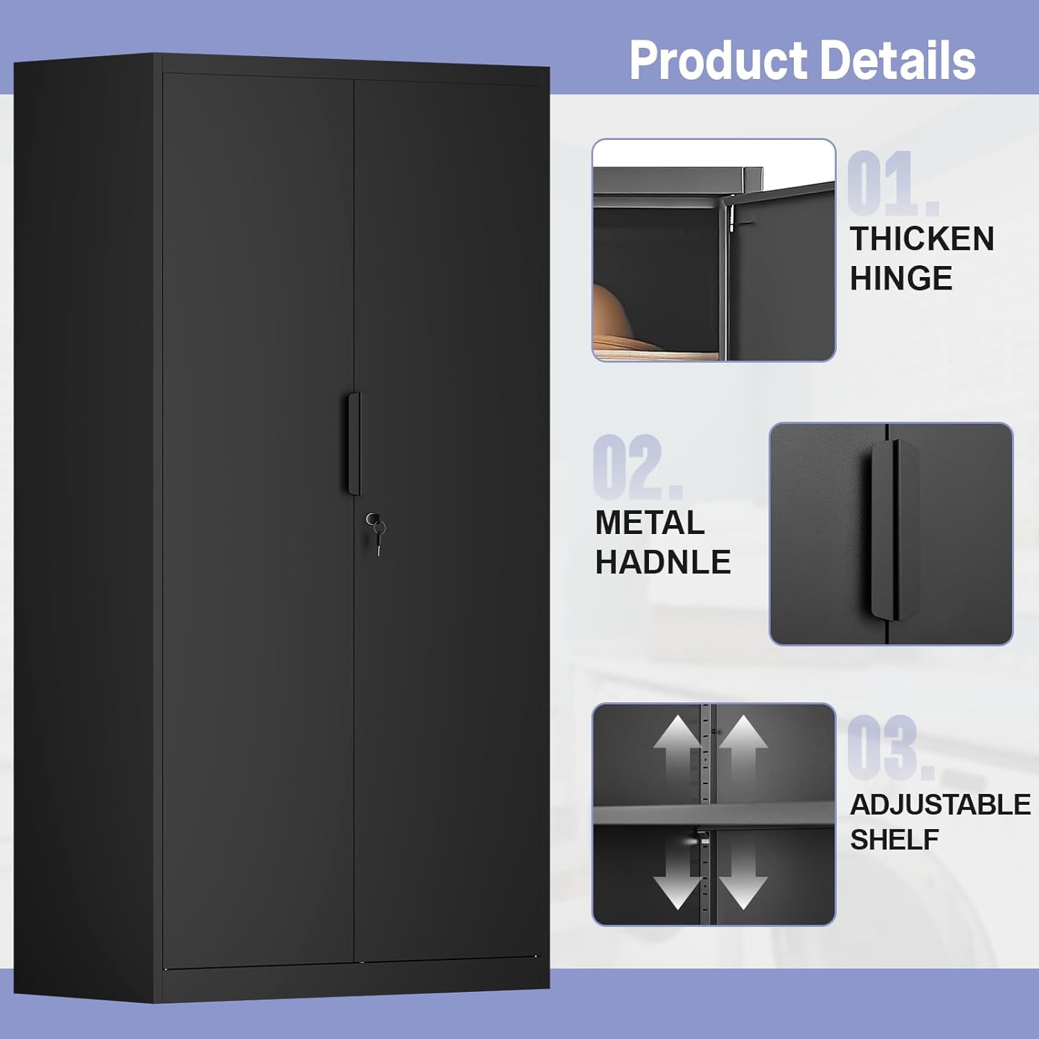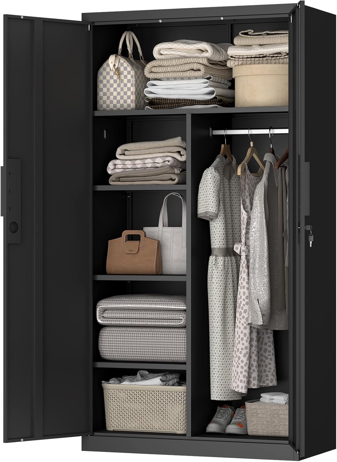 IRONFFICE Metal Storage Cabinet,Steel Armoire Wardrobe Closet with Adjustable Shelves,Hanging Rod,Almirah for Clothes,Locking Wardrobe Cabinet for Bedroom,Home,Black