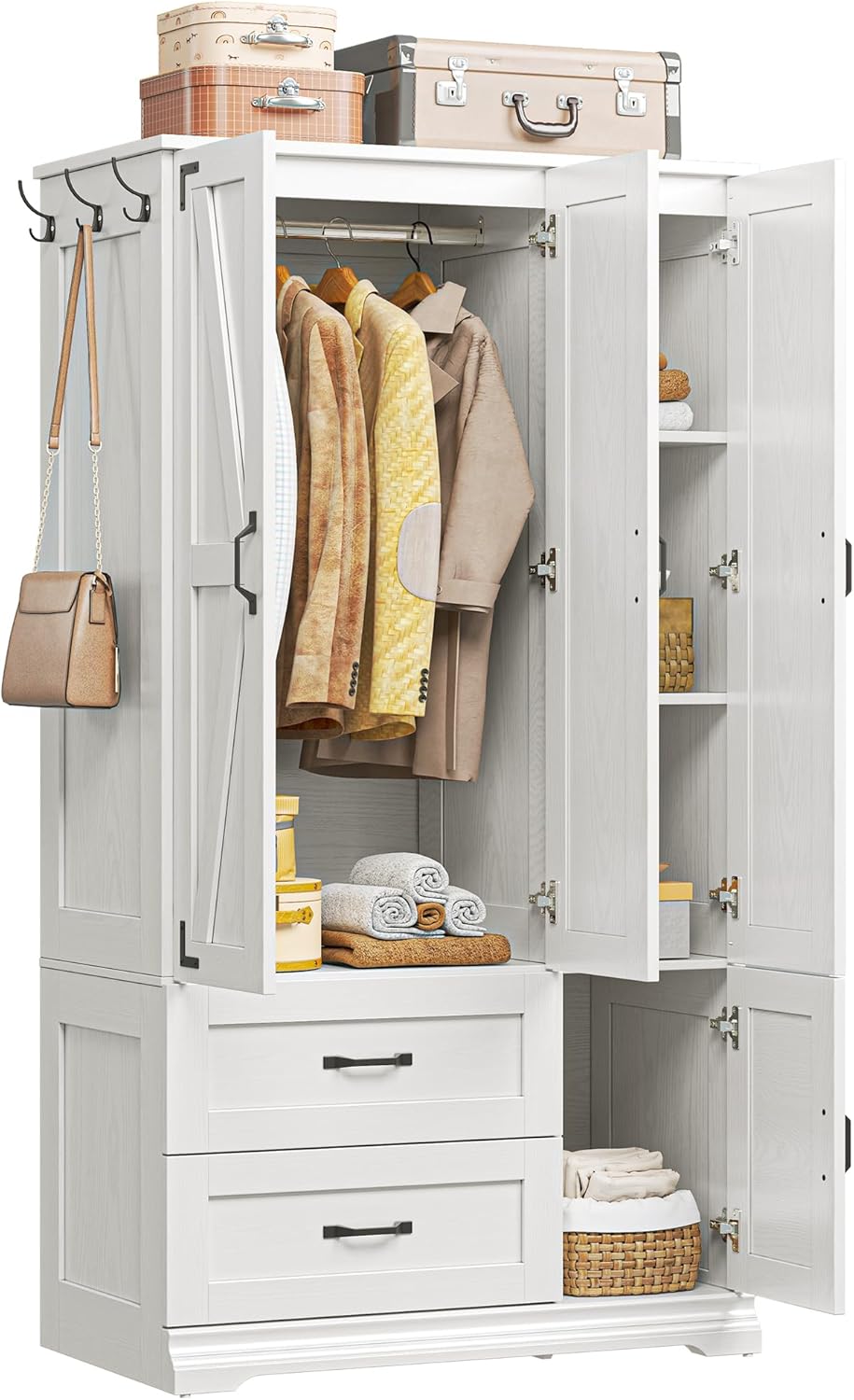LIKIMIO Armoire Wardrobe Closet 71″ H, Bedroom Wooden Wardrobe with 4 Doors and 2 Drawers, Farmhouse Clothing Storage Cabinet Combination with Hanging Rod, Shelves, and Hooks, White